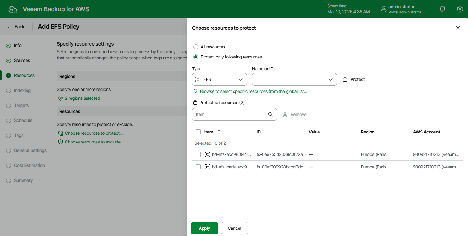 If you select the Protect only following resources option, you must specify the EFS file systems explicitly: