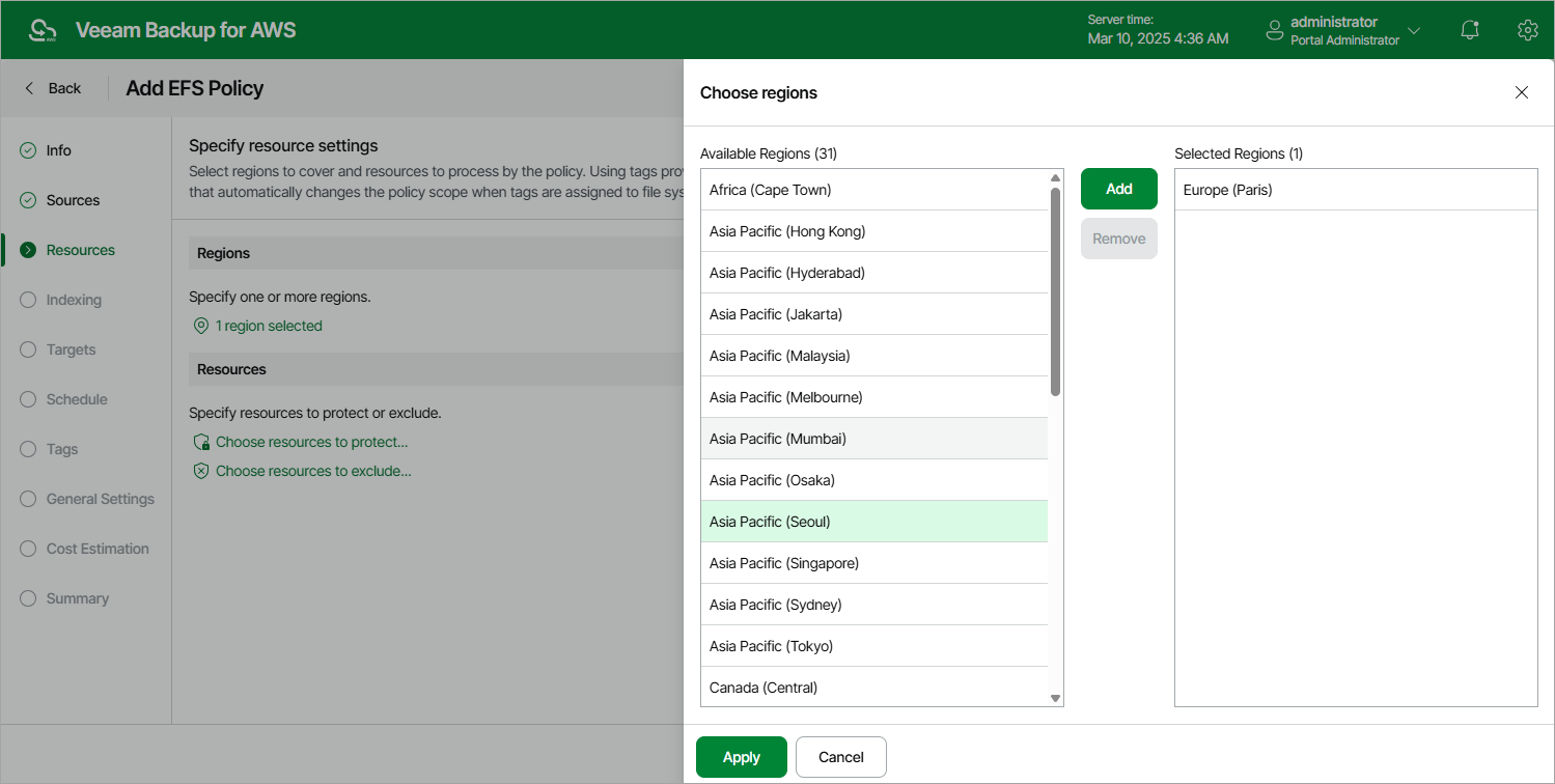In the Regions section of the Resources step of the wizard, select AWS Regions where EFS file systems that you plan to back up reside: