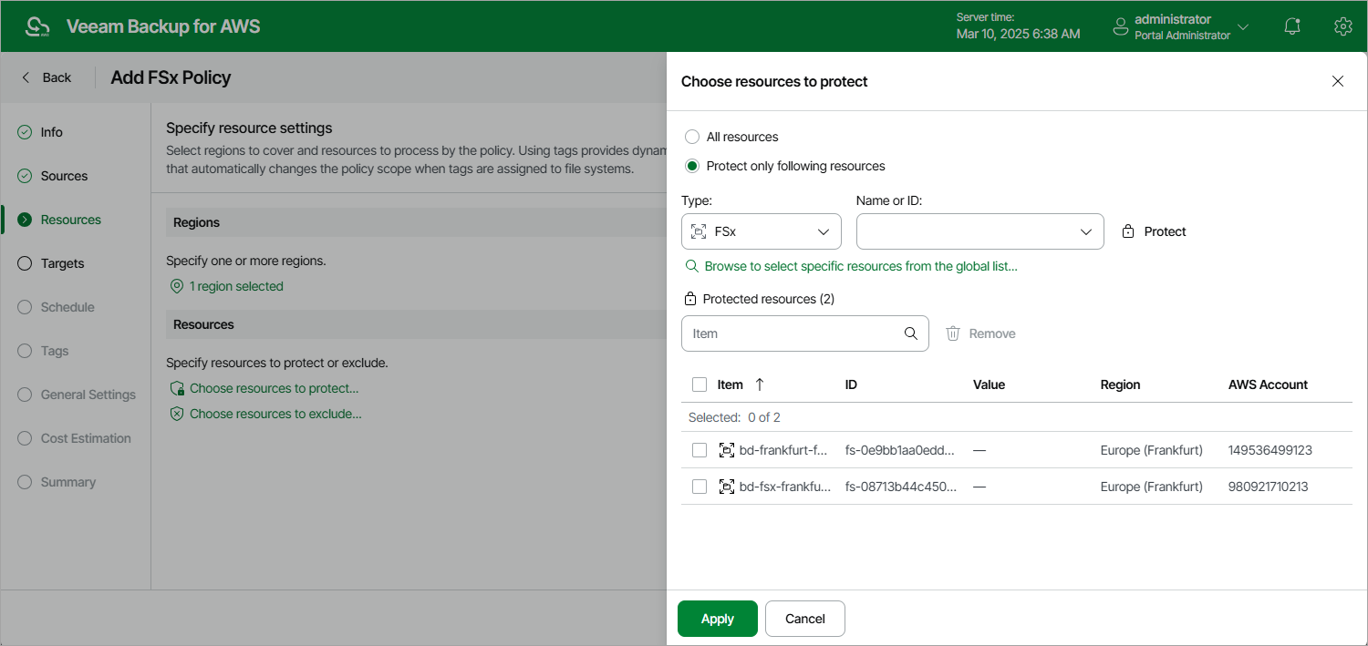 If you select the Protect only following resources option, you must specify the FSx file systems explicitly: