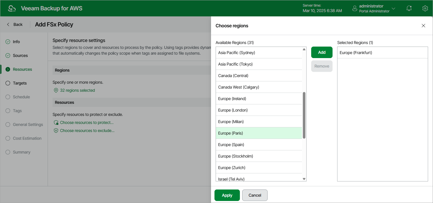 In the Regions section of the Resources step of the wizard, select AWS Regions where FSx file systems that you plan to back up reside: