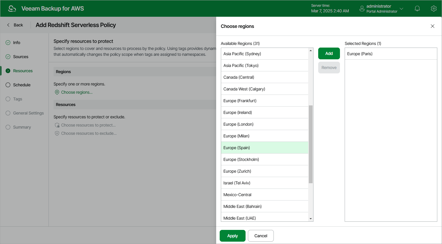 In the Regions section of the Resources step of the wizard, choose AWS Regions where Redshift Serverless namespaces that you plan to back up reside: