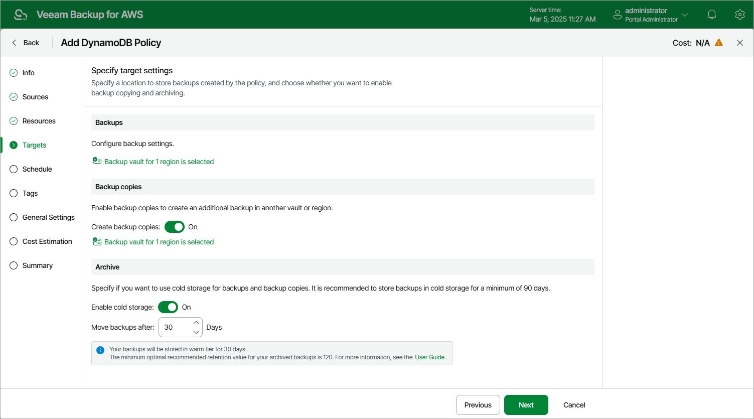 - In the Archive section of the Targets step of the wizard, set the Enable cold storage toggle to On.