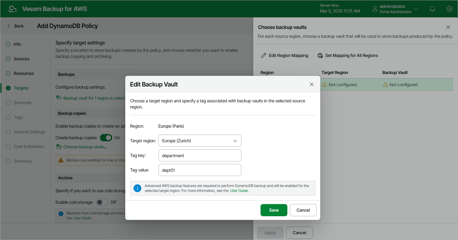 - From the Target region drop-down list, select the target AWS Region to which Veeam Backup for AWS must copy created backups of the selected tables.