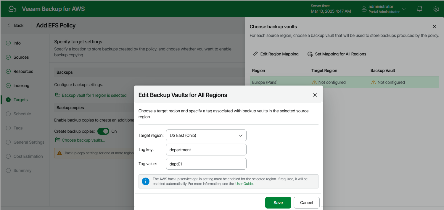- From the Target region drop-down list, select the target AWS Region to which Veeam Backup for AWS must copy created backups of the selected file systems.