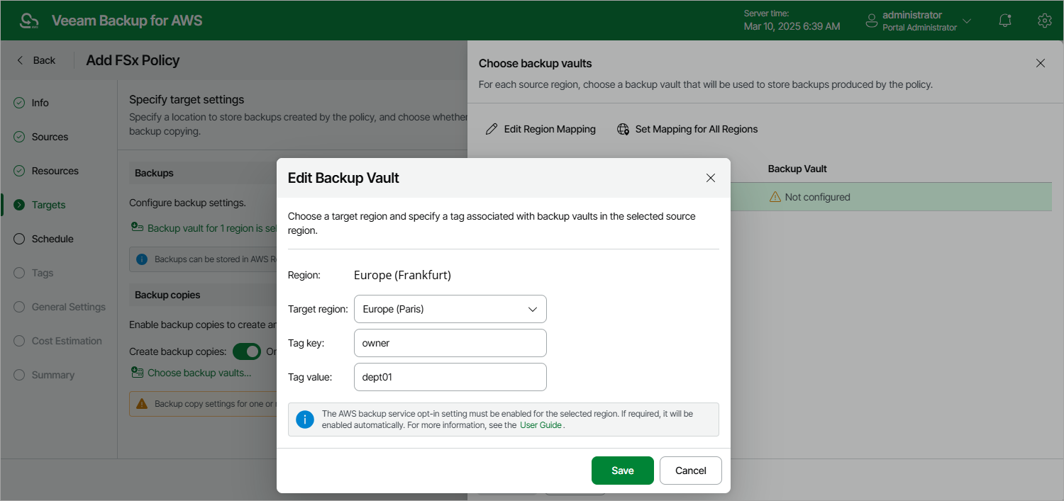 1. From the Target region drop-down list, select the target AWS Region to which Veeam Backup for AWS must copy created backups of the selected file systems.