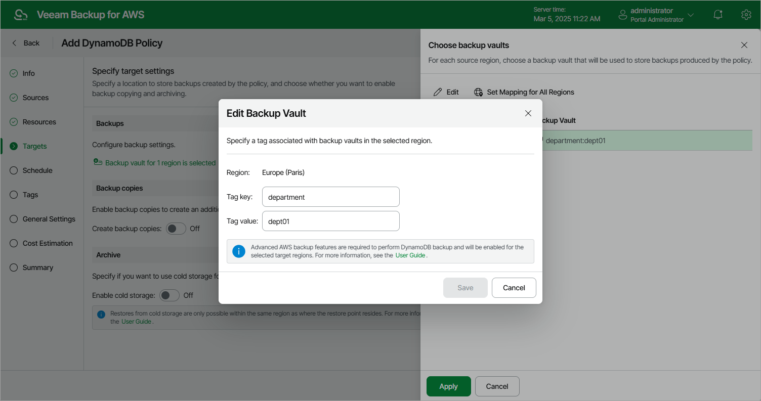 - [Applies only if you have chosen the Organization option at the Sources step of the wizard] In the Edit Backup Vault window, in the Tag key and Tag value fields, specify a key and value of the AWS tag associated with the necessary backup vaults. The backup vault with the specified tag must be created in each AWS account within the AWS Organization or organizational units added to the backup policy. Note that the specified tag must not be associated with multiple backup vaults in the same AWS Region and account within the organization.
