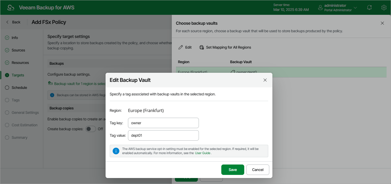 - [Applies only if you have chosen the Organization option at the Sources step of the wizard] In the Edit Backup Vault window, in the Tag key and Tag value fields, specify a key and value of the AWS tag associated with the necessary backup vaults. The backup vault with the specified tag must be created in each AWS account within the AWS Organization or organizational units added to the backup policy. Note that the specified tag must not be associated with multiple backup vaults in the same AWS Region and account within the organization.