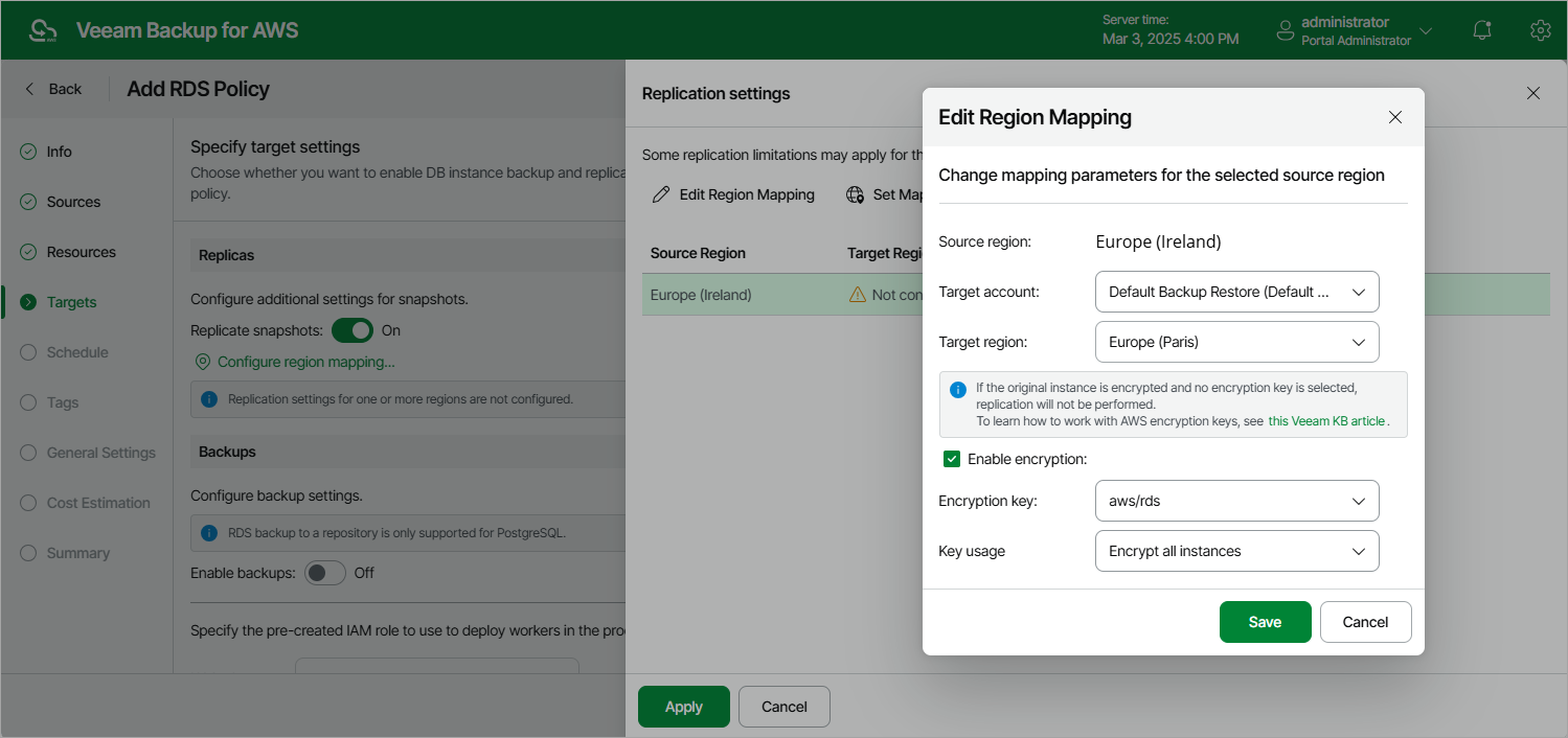 - If you want to encrypt the replicated cloud-native snapshots with an AWS KMS key, select the Enable encryption check box and choose the necessary KMS key from the Encryption key drop-down list. Then, use the Key usage drop-down list to choose whether you want to encrypt snapshots for all resources or only snapshots of the encrypted resources. Note that if the source DB instances or Aurora DB clusters are encrypted, you must enable encryption for replicated snapshots as well; if the source Aurora DB clusters are unencrypted, the encryption must be disabled for replicated snapshots as well — otherwise, the replication process will fail to complete successfully.