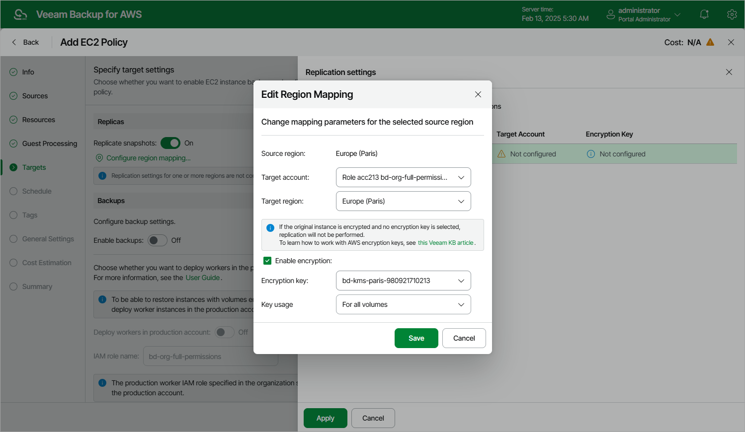 - If you want to encrypt the replicated cloud-native snapshots with an AWS KMS key, select the Enable encryption check box and choose the necessary KMS key from the Encryption key drop-down list. Then, use the Key usage drop-down list to choose whether you want to encrypt snapshots for all volumes or only snapshots of the encrypted volumes. Note that if the original EBS volumes are encrypted, you must enable encryption for replicated snapshots as well — otherwise, the replication process will fail to complete successfully.