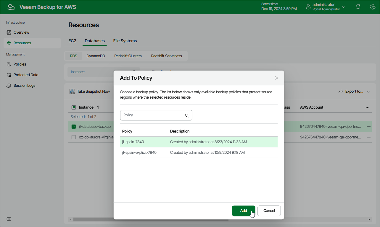 Veeam Backup for AWS does not support adding AWS Organizations resources to backup policies. |
