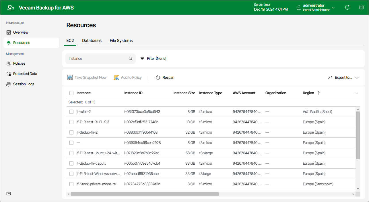 After you create a backup policy to protect a specific type of AWS resources, Veeam Backup for AWS rescans AWS Regions specified in the policy settings and populates the resource list on the Resources page with all resources of that type residing in these regions. If an AWS Region is no longer specified in any configured backup policy, Veeam Backup for AWS removes all resources residing in the region from the list of available resources.