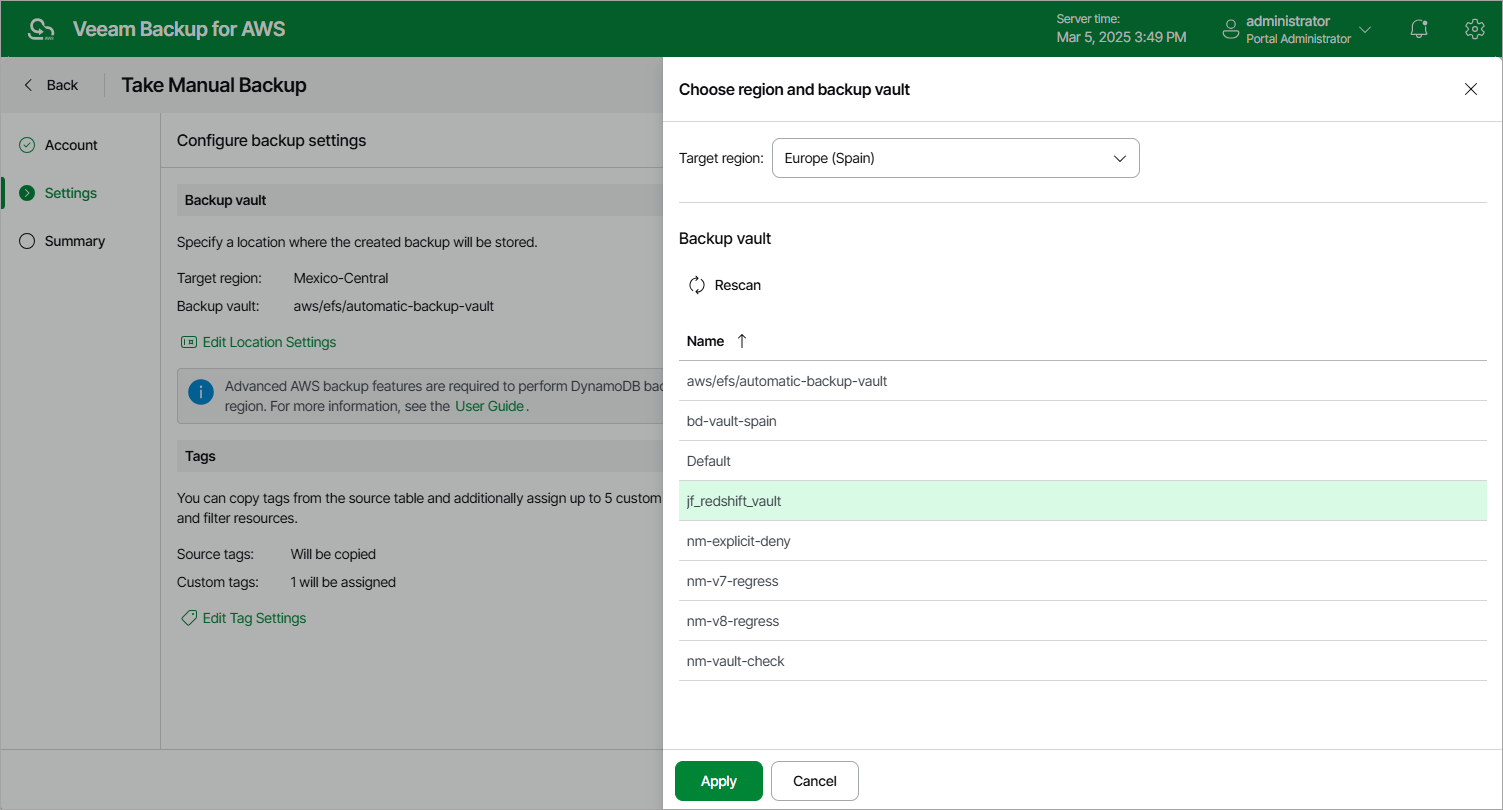 For a backup vault to be displayed in the list of available vaults, it must be created in the AWS Backup console as described in AWS Documentation. If you have not created a backup vault for the selected AWS Region, Veeam Backup for AWS will display only the default backup vault created for the AWS Region automatically.