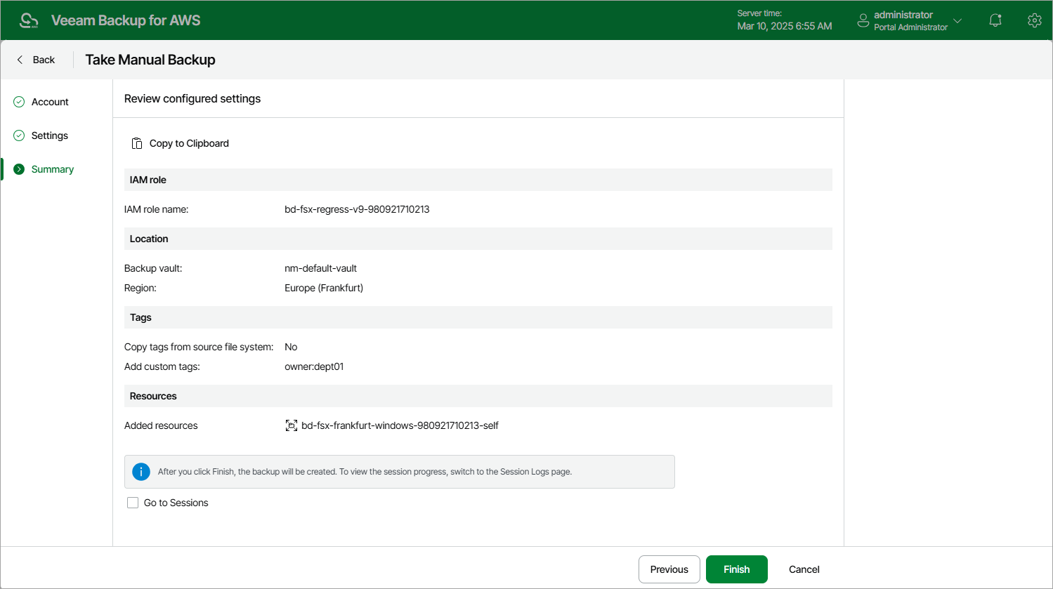 Veeam Backup for AWS allows you to manually create backups of Amazon FSx file systems. You can instruct Veeam Backup for AWS to store the created backups in the same AWS Regions where the processed file systems reside, or in a different AWS Region.