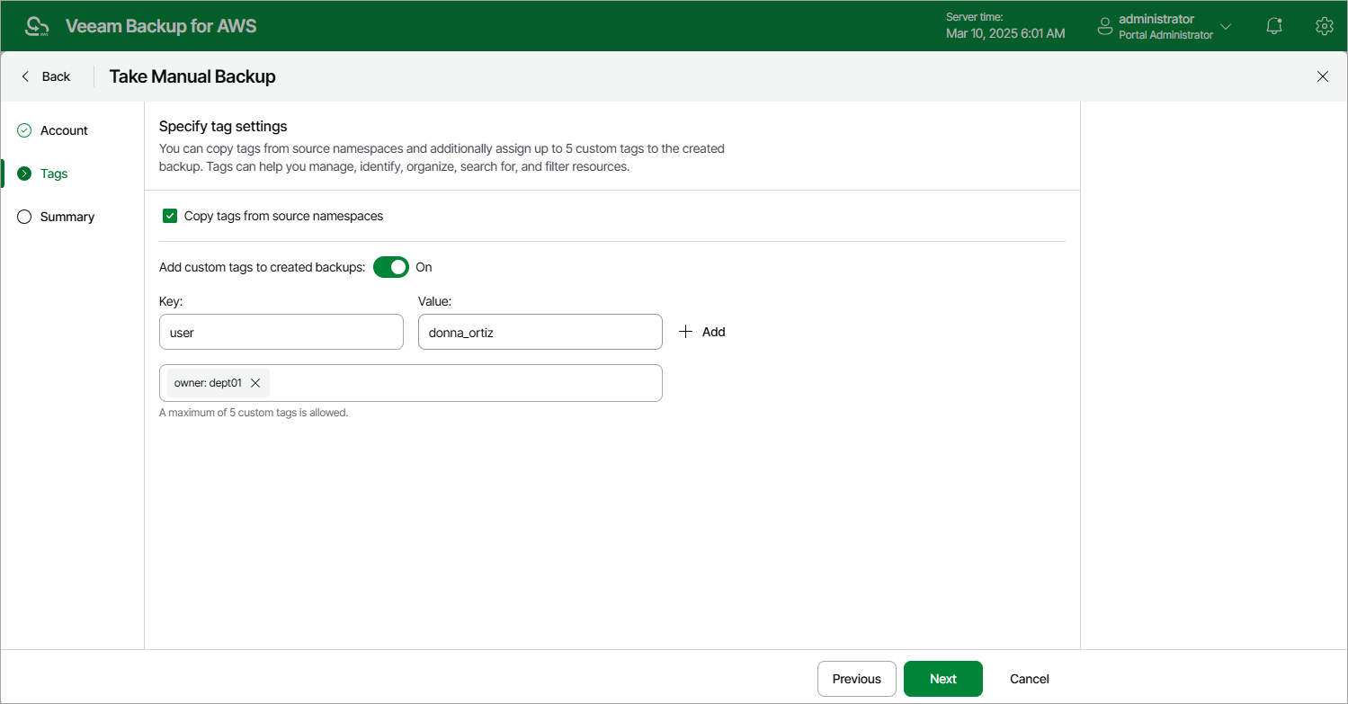 If you choose to add custom tags to created backups, Veeam Backup for AWS will assign the specified tags right after it creates a backup.