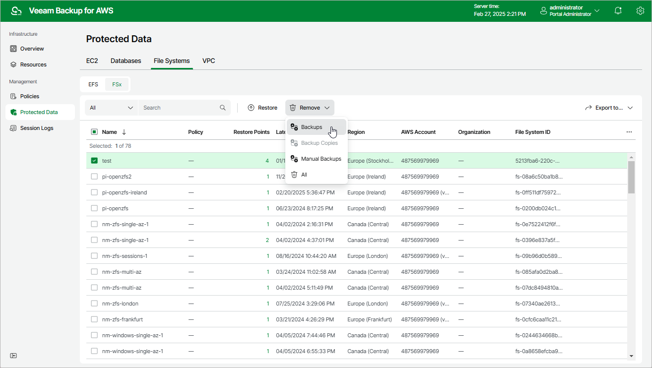 Veeam Backup for AWS applies the configured retention policy settings to automatically remove FSx file system backups and backup copies created by backup policies. If necessary, you can also remove the backed-up data manually.