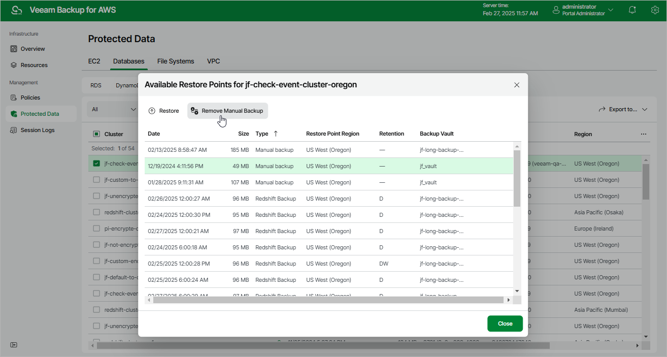 - In the Available Restore Points window, select a backup that you want to remove, and click Remove Manual Backup.