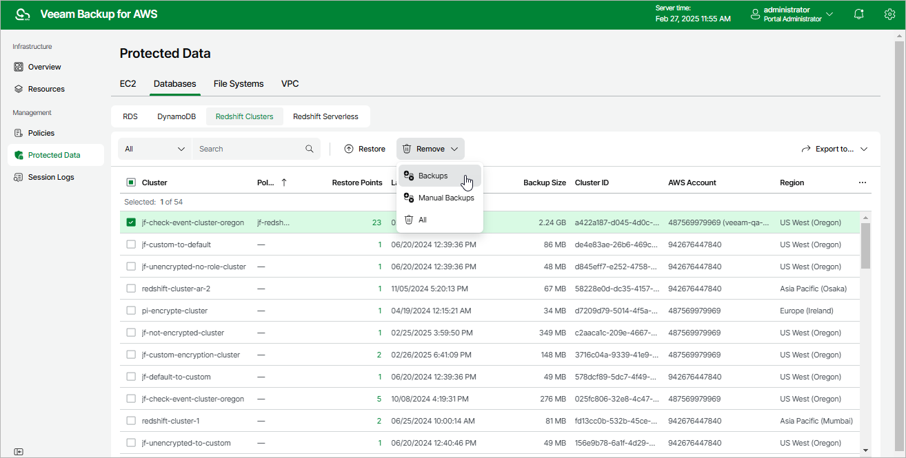 - Backups — to remove Redshift backups created for the selected cluster by backup policies.