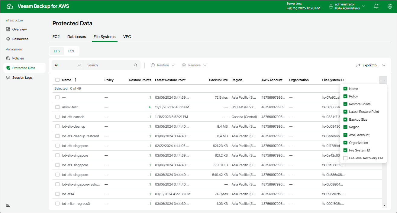 After a backup policy successfully creates a restore point of an EFS file system according to the specified schedule, or after you create a backup of an EFS file system manually, Veeam Backup for AWS adds the file system to the resource list on the Protected Data page.
