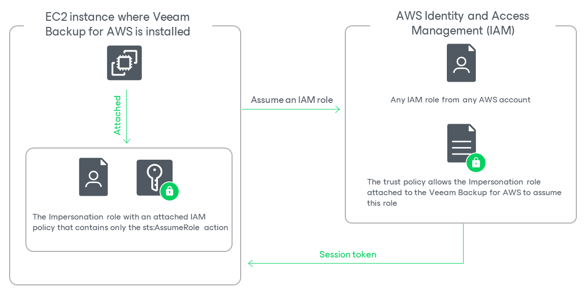 When you deploy a backup appliance, Veeam Backup for AWS automatically creates a specific IAM role named Impersonation role — and attaches this role to the backup appliance. The Impersonation IAM role is then used to assume other IAM roles added to Veeam Backup for AWS to perform operations in your infrastructure, and is automatically assigned the sts:AssumeRole permission required to assume these roles.