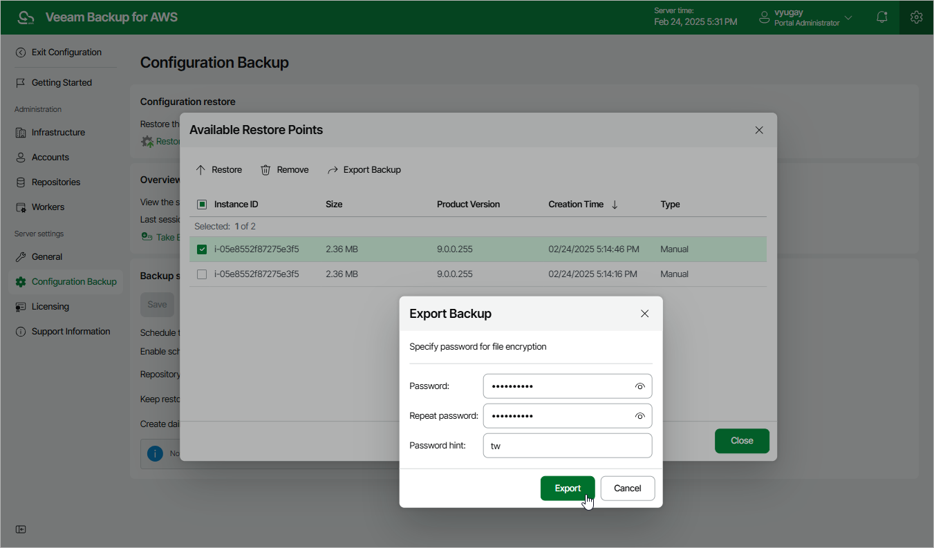 Once Veeam Backup for AWS creates a successful configuration backup, you can export the configuration backup file and use it to restore configuration data on another backup appliance.