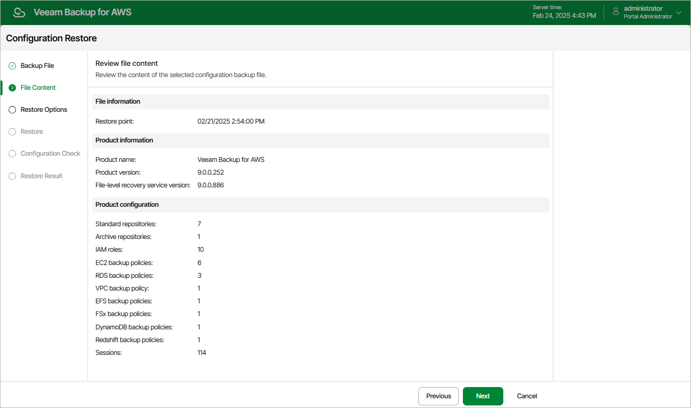 Veeam Backup for AWS will analyze the content of the selected backup file and display the following information:
