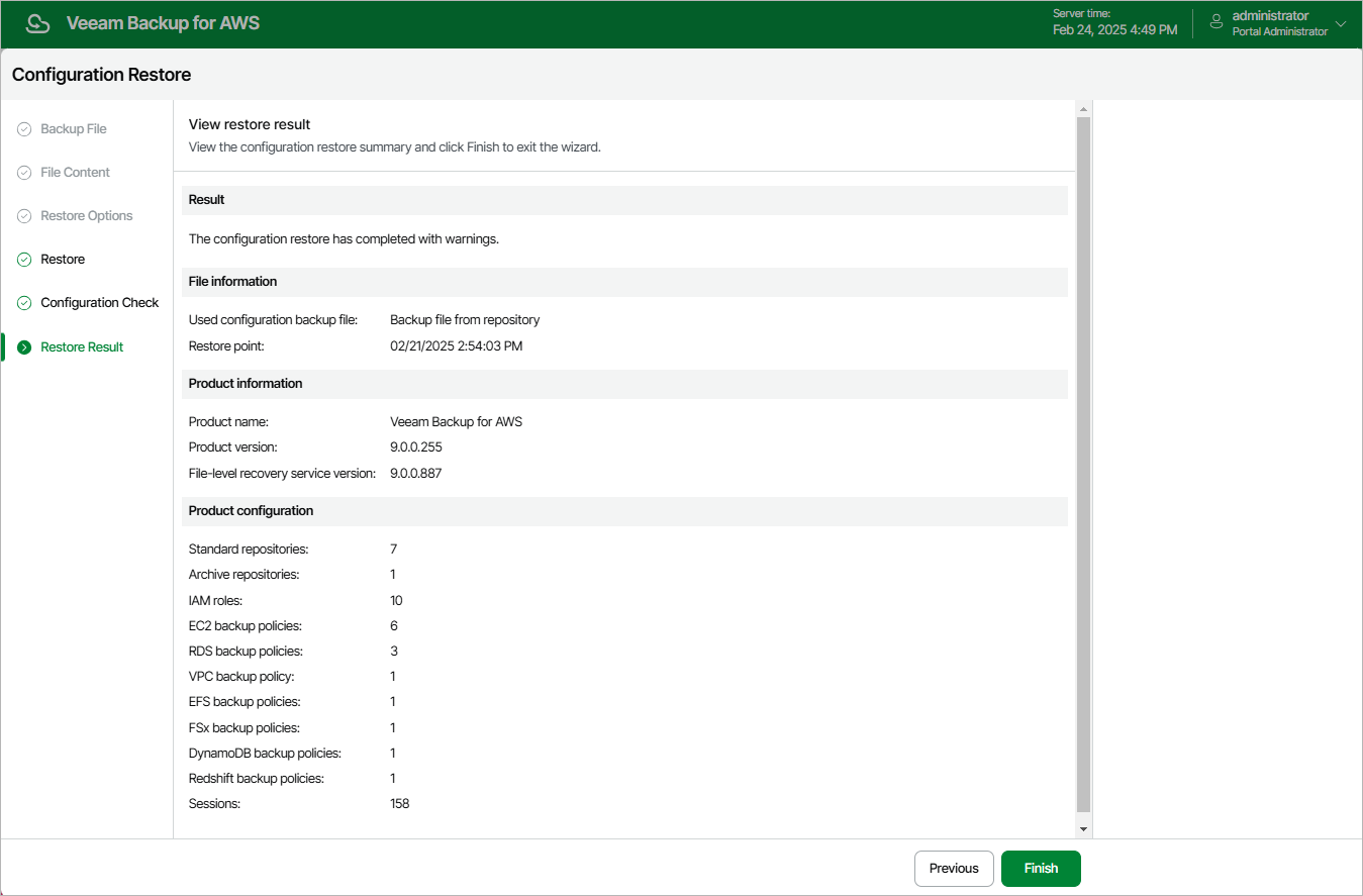 This is an archive version of the document. To get the most up-to-date information, see the current version. Step 7. Finish Working with Wizard At the Summary step of the wizard, click Finish to finalize the process of configuration data restore.