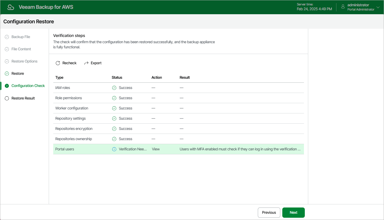 After the restore process is over, Veeam Backup for AWS will run a number of verification checks to confirm that the configuration data has been restored successfully. At the Configuration Check step of the wizard, wait for the verification checks to complete and check whether Veeam Backup for AWS encountered any configuration issues.