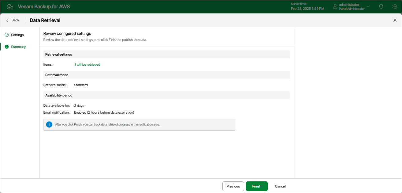 If you cancel the Data Retrieval session, or the Veeam Backup for AWS service is restarted while the Data Retrieval session is still running, AWS will retrieve data anyway and keep it for the specified availability period. However, Veeam Backup for AWS will not be able to access the retrieved data. |