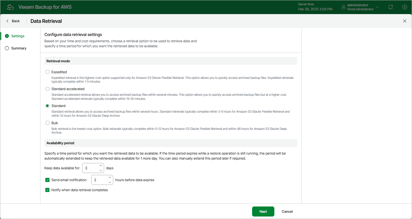 - In the Retrieval mode section, select the retrieval option that Veeam Backup for AWS will use to retrieve the data.