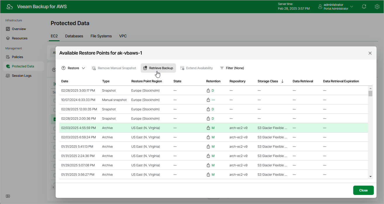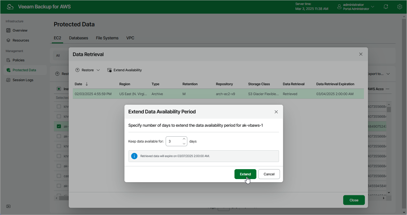 Backups stored in archive backup repositories are not immediately accessible. If you want to restore an EC2 instance from a backup that is stored in a repository of the S3 Glacier Flexible Retrieval or S3 Glacier Deep Archive storage class, you must first retrieve the archived data. During the data retrieval process, a temporary copy of the archived data is created in an Amazon S3 bucket where the repository located. This copy is stored in the S3 standard storage class for a period of time that you specify when launching the data retrieval process. If the time period expires while a restore operation is still running, Veeam Backup for AWS automatically extends the period to keep the retrieved data available for 1 more day. You can also extend the availability period manually.