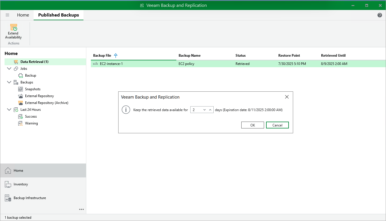 During the data retrieval process, a temporary copy of the archived data is created in an Amazon S3 bucket where the archive backup repository is located. This copy is stored in the S3 standard storage class for a period of time that you specify when launching the data retrieval process. If the time period expires while a restore operation is still running, Veeam Backup for AWS automatically extends the period to keep the retrieved data available for 1 more day. You can also extend the availability period manually.
