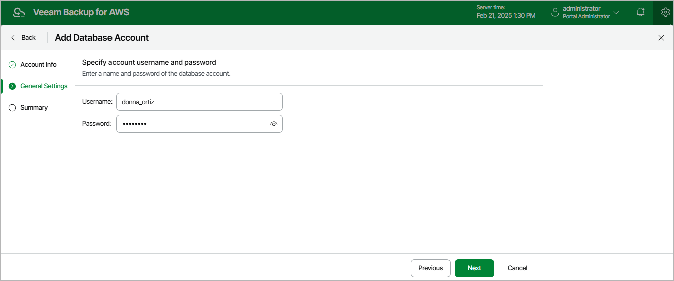 This is an archive version of the document. To get the most up-to-date information, see the current version. Step 3. Specify General Settings At the General Settings step of the wizard, specify credentials that the account will use to access databases protected by backup policies.