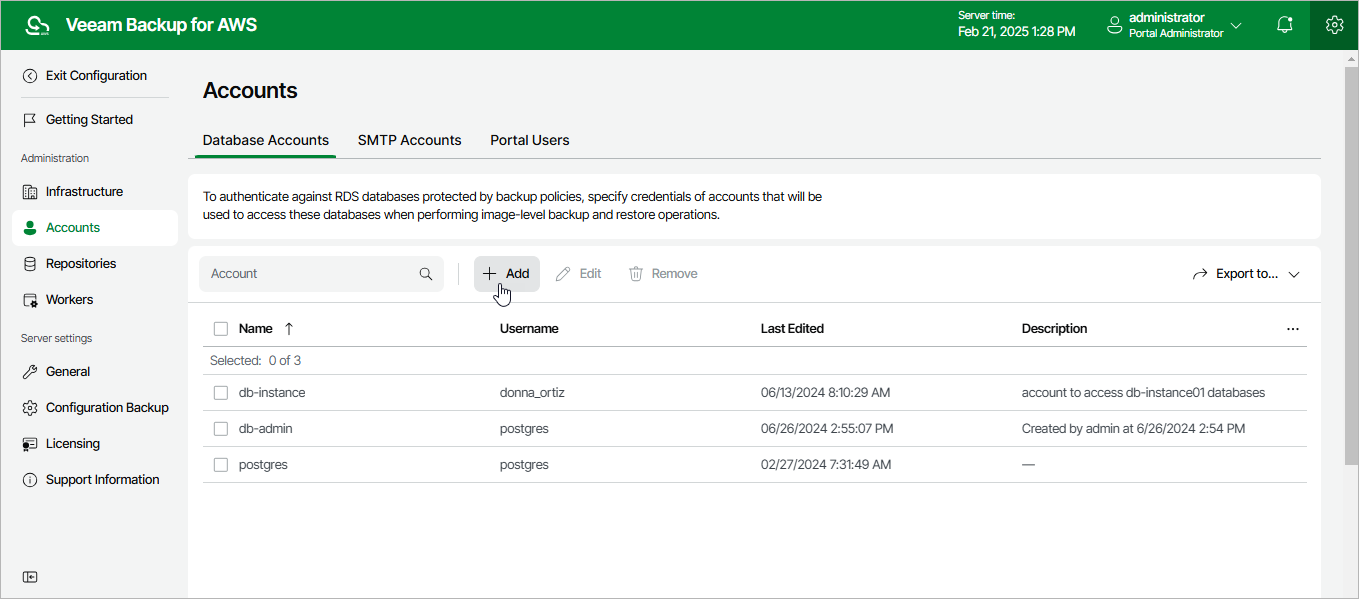 This is an archive version of the document. To get the most up-to-date information, see the current version. Step 1. Launch Add Account Wizard To launch the Add Database Account wizard, do the following:Switch to the Configuration page.Navigate to Accounts > Database Accounts.Click Add.