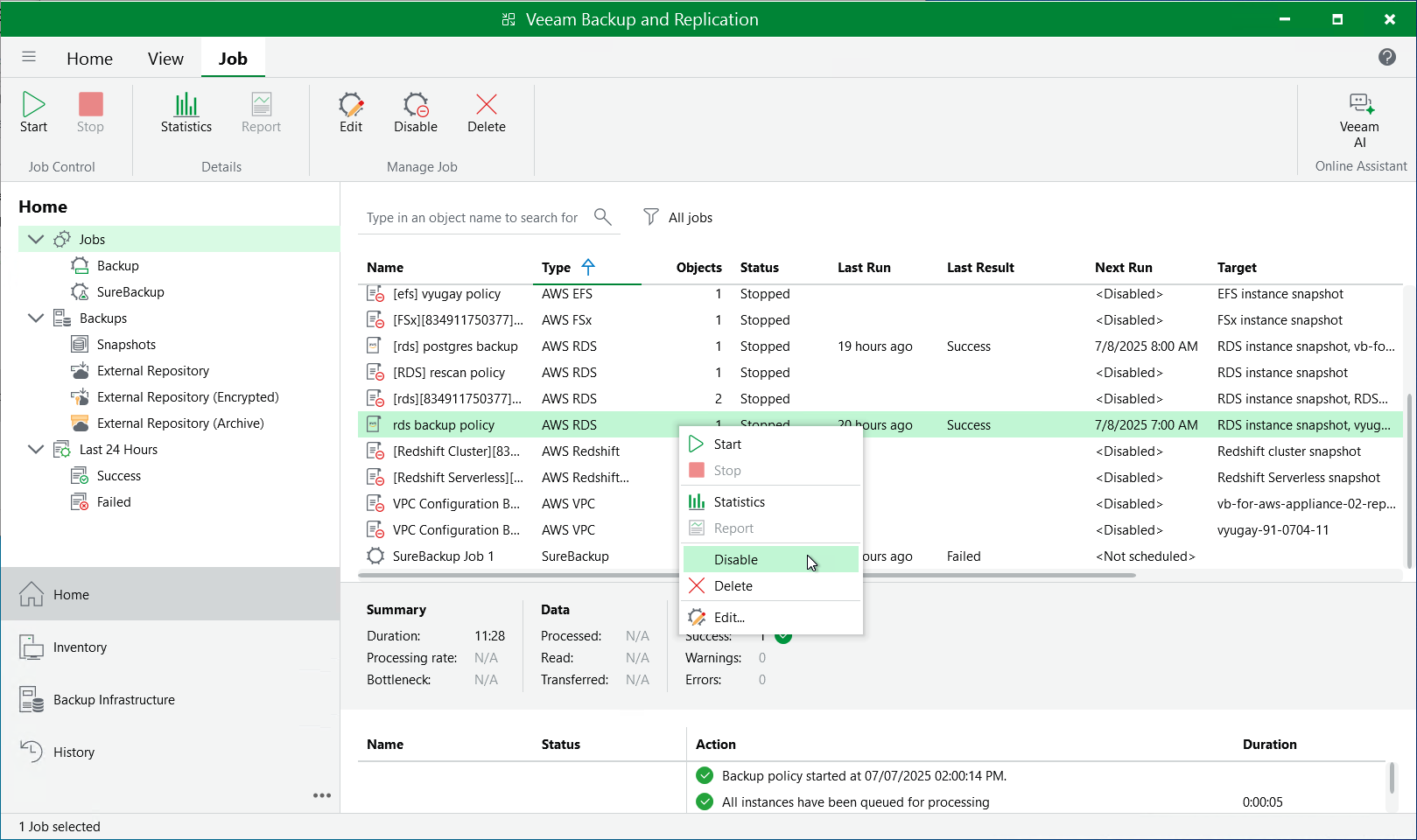 Alternatively, you can right-click the necessary backup policy and select Disable.