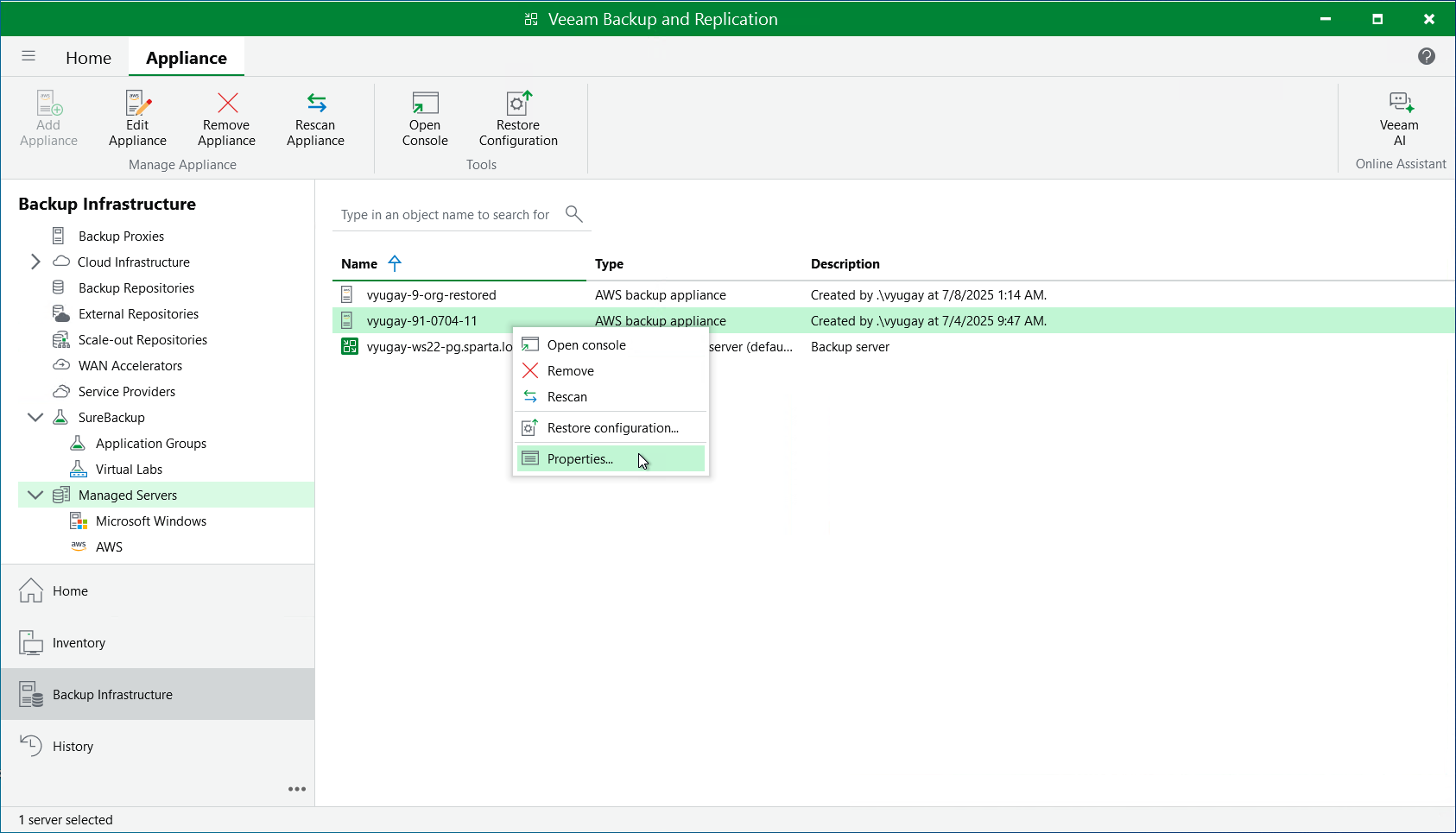 - Select the necessary backup appliance and click Edit Appliance on the ribbon.