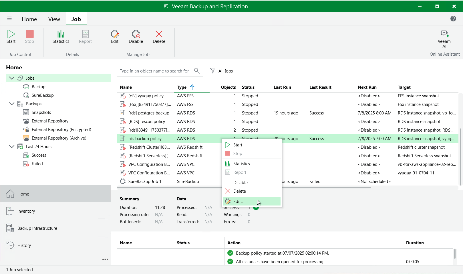 You can edit backup policies in the Veeam Backup for AWS Web UI only. However, you can launch the edit policy wizard directly from the Veeam Backup & Replication console. To do that, do the following:
