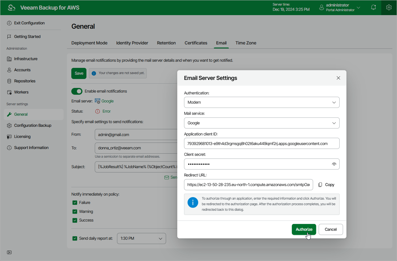 If you plan to send notifications using the Google email service, make sure that the Veeam Backup for AWS Web UI is open using the public IPv4 DNS.