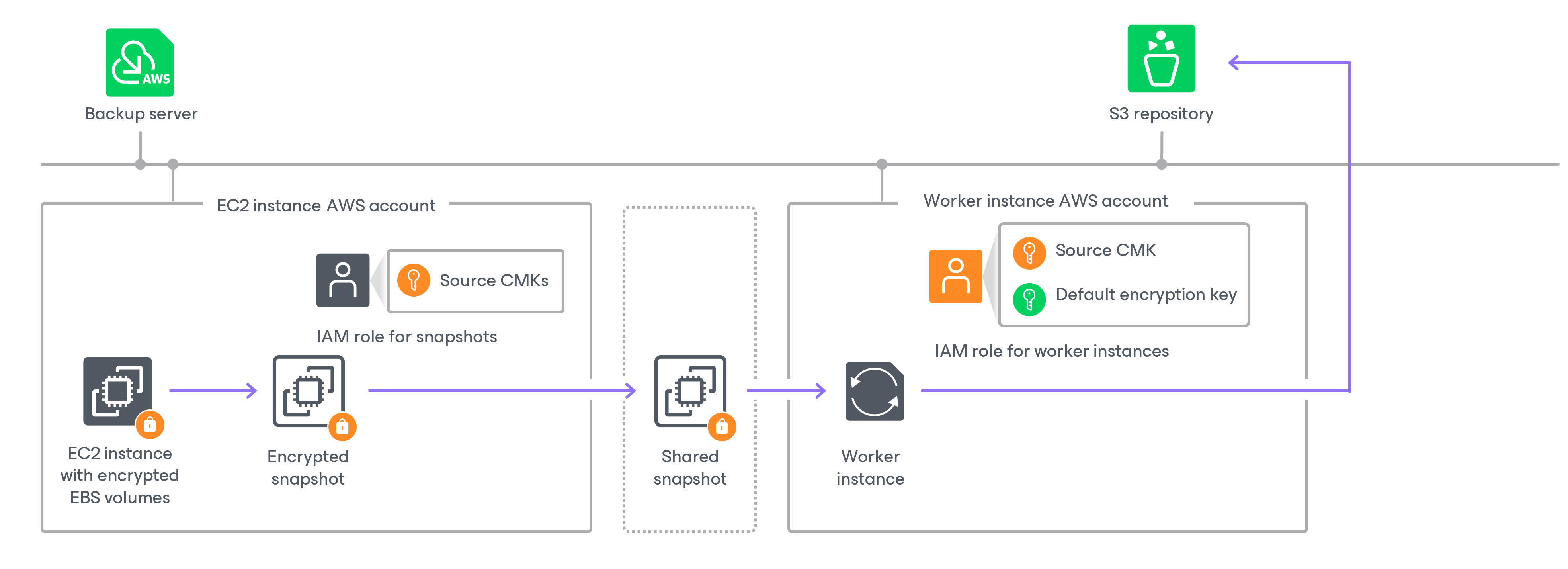 - Creates encrypted EBS volumes from the shared encrypted snapshot, and then attaches them to the worker instance for reading and further transferring EBS volume data to a backup repository.