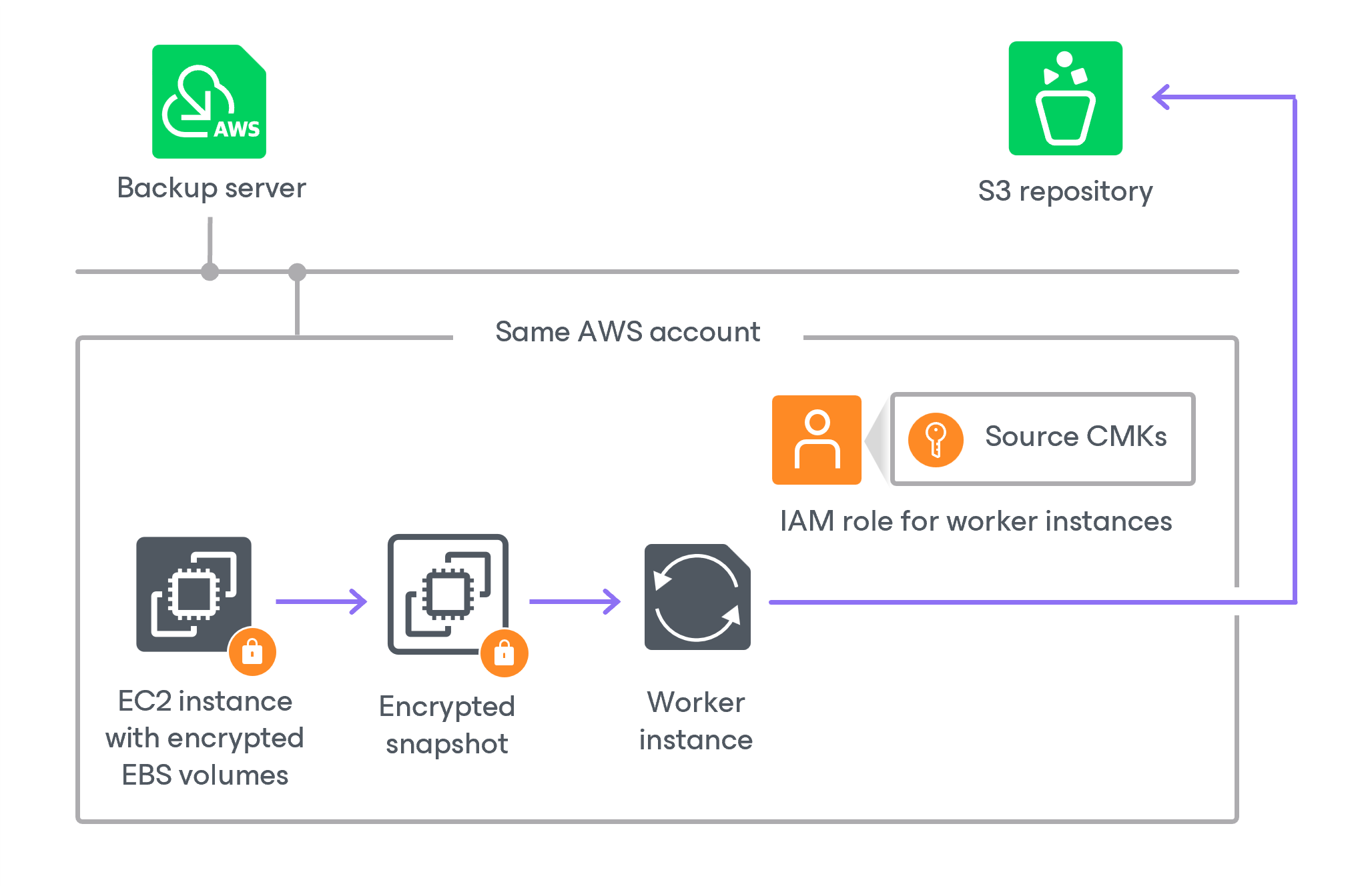 If a worker instance is deployed in the same AWS account to which the processed EC2 instance belongs, Veeam Backup for AWS performs the following steps: