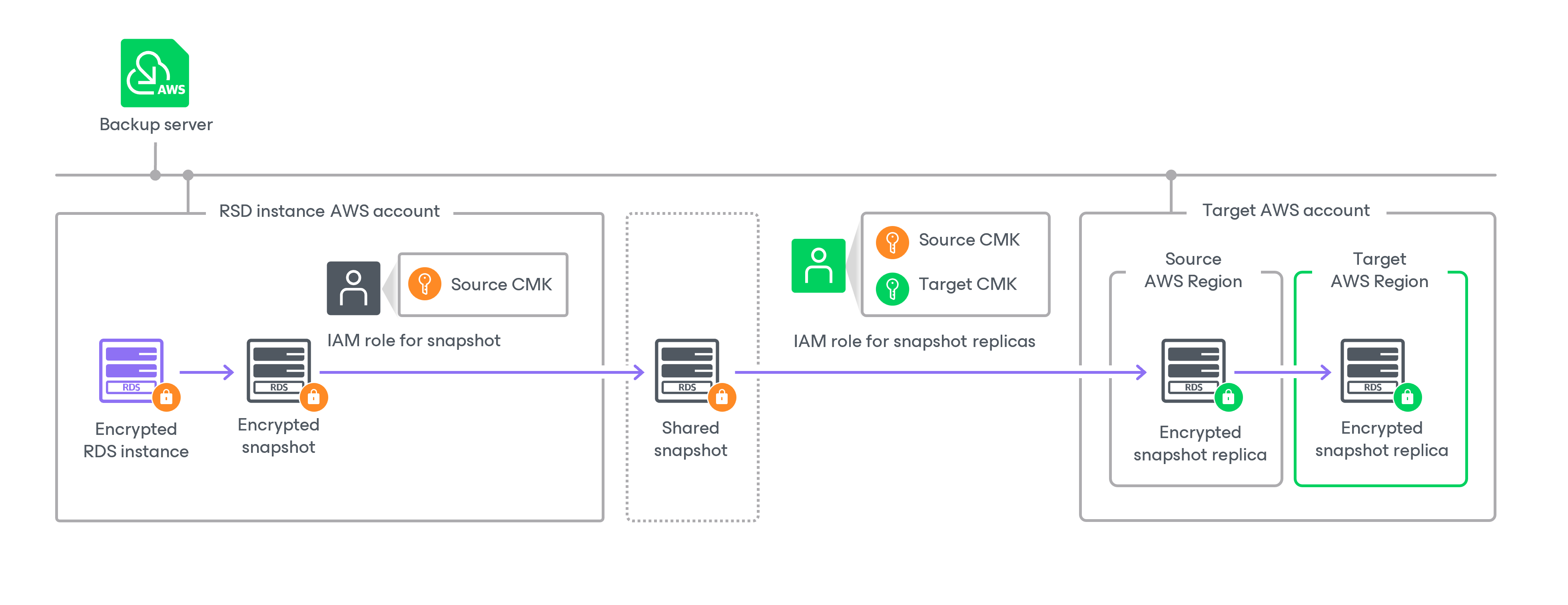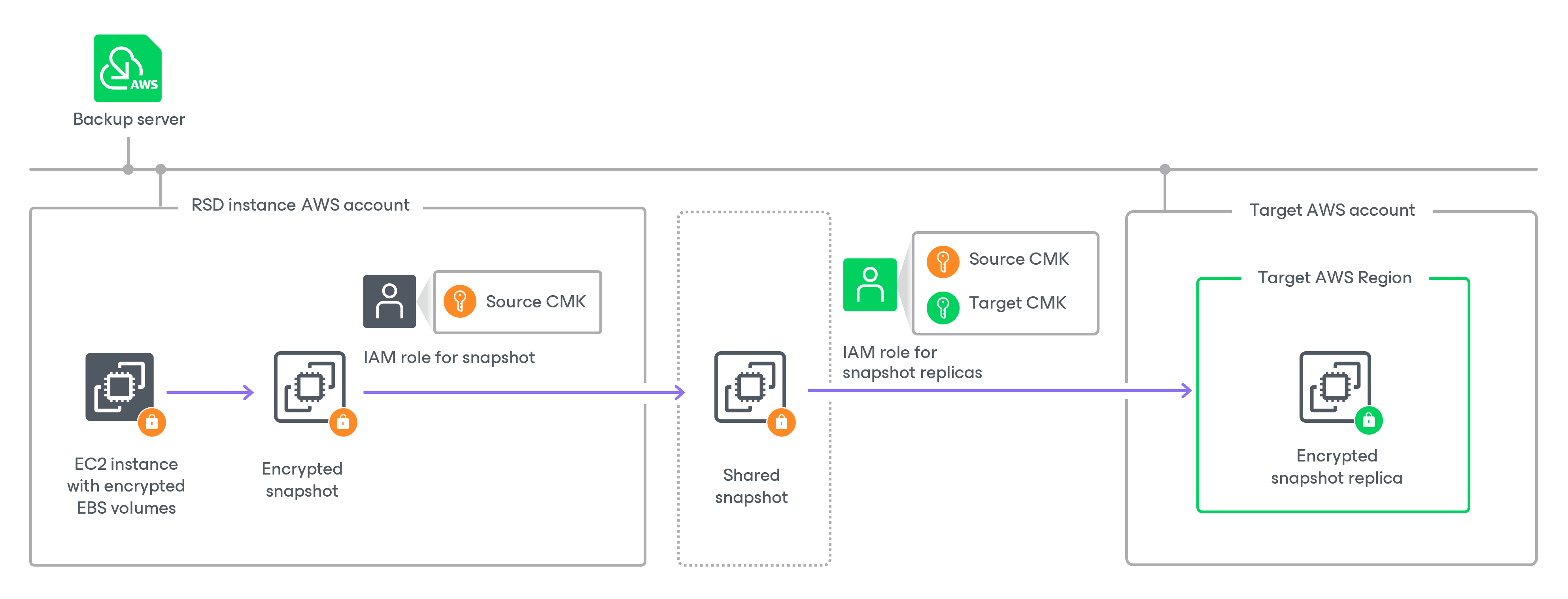 The process of creating a snapshot replica of an encrypted RDS instance and an EC2 instance with encrypted EBS volumes differs depending on whether you create snapshot replicas within the same AWS account to which the instance belongs or not: