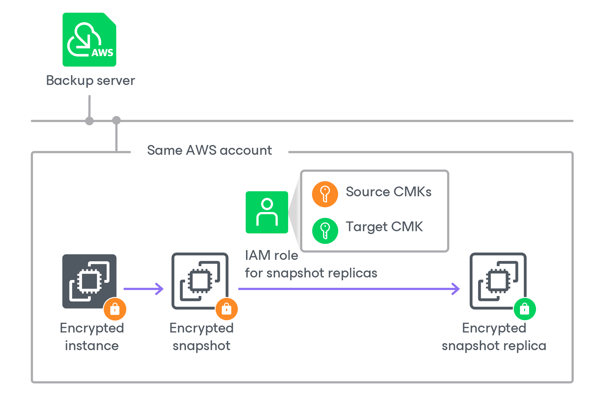 To create a snapshot replica in the same AWS account to which the encrypted EC2 or RDS instance belongs, Veeam Backup for AWS performs the following steps: