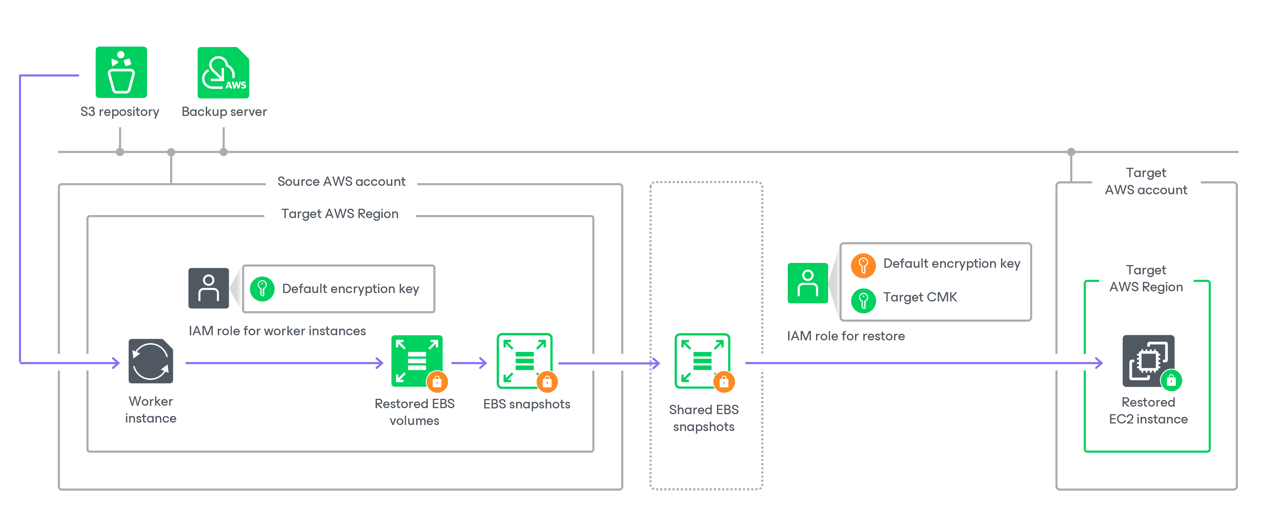 If a worker instance is deployed in an AWS account other than the AWS account to which the restored EC2 instance will belong, Veeam Backup for AWS performs the following steps: