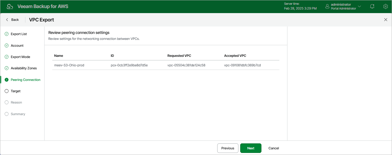 At the Peering Connection step of the wizard, review VPC peering connection settings. You cannot modify the VPC peering connection settings for the exported VPC. By default, Veeam Backup for AWS will export VPC peering connections as follows:
