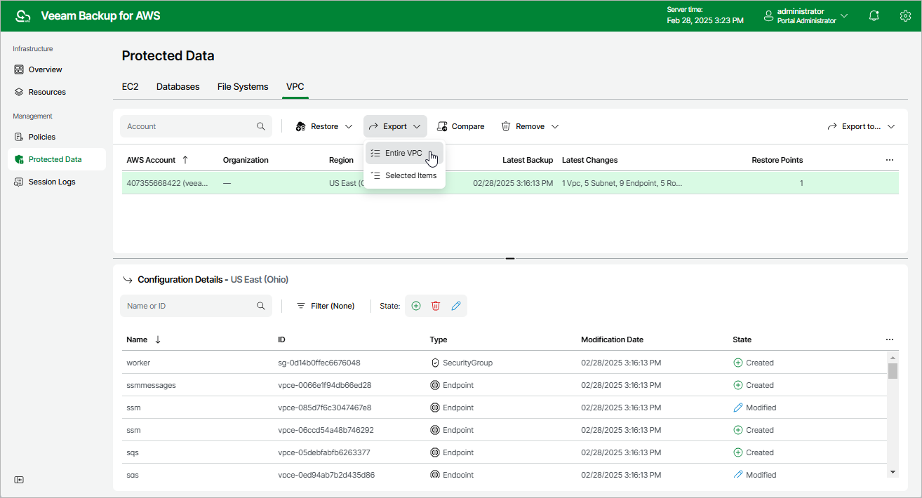 This is an archive version of the document. To get the most up-to-date information, see the current version. Step 1. Launch VPC Export Wizard To launch the VPC Export wizard, do the following:Navigate to Protected Data > VPC.Select the configuration record for an AWS Region whose VPC configuration you want to export.Click Export > Entire VPC.