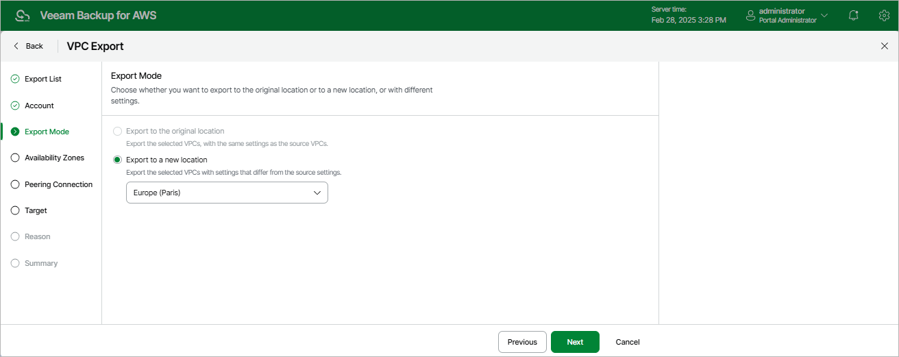 At the Export Mode step of the wizard, choose whether you plan to restore the exported VPC configuration to the original or to a custom location. If you select the Export to a new location option, specify the target AWS Region where the VPC configuration will be restored.