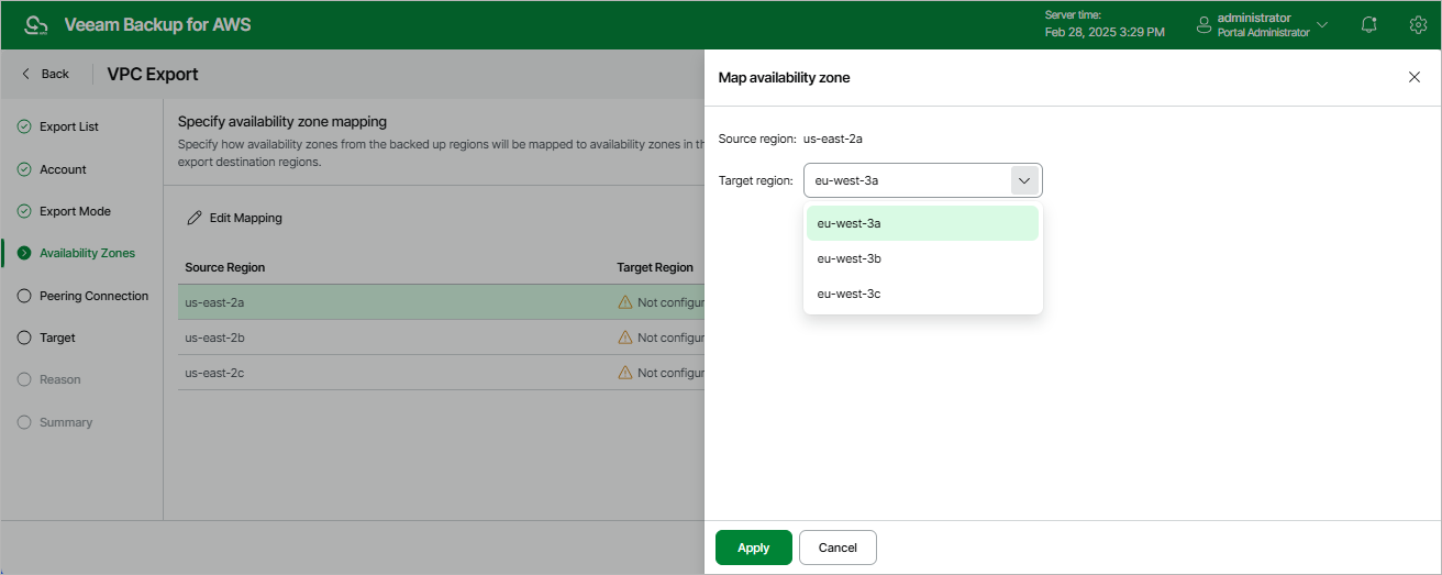 At the Availability Zones step of the wizard, for each source Availability Zone, choose an Availability Zone in the target AWS Region where VPC configuration items of the source Availability Zone will be restored: