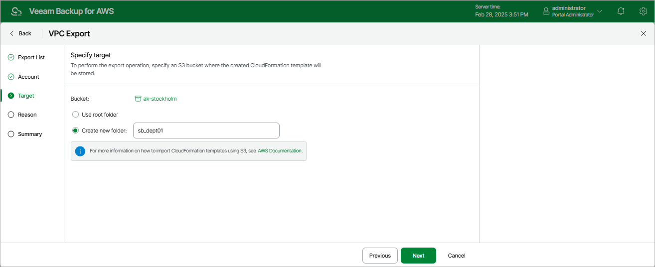 At the Target step of the wizard, specify an Amazon S3 bucket where Veeam Backup for AWS will save the CloudFormation template with the exported VPC configuration items.