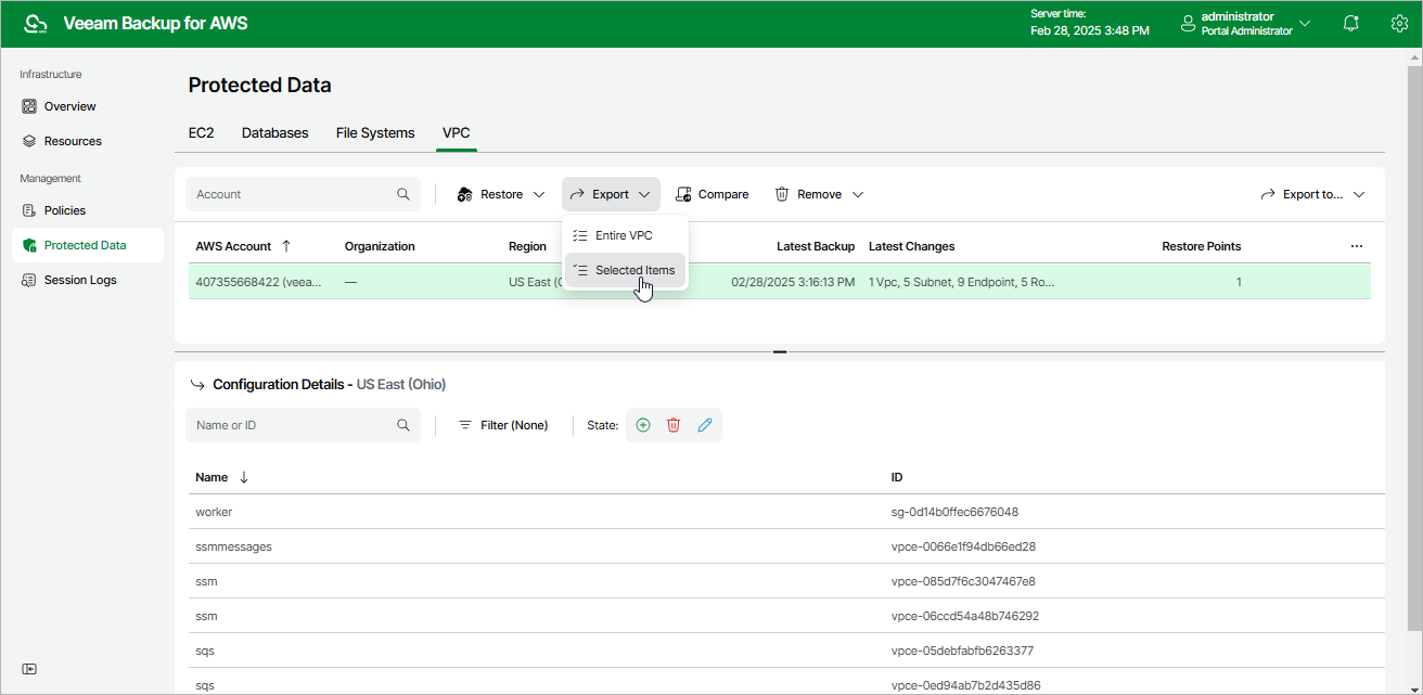 This is an archive version of the document. To get the most up-to-date information, see the current version. Step 1. Launch VPC Export Wizard To launch the VPC Export wizard, do the following.Navigate to Protected Data > VPC.Select the configuration record for an AWS Region whose VPC configuration you want to restore.Click Export > Selected items.