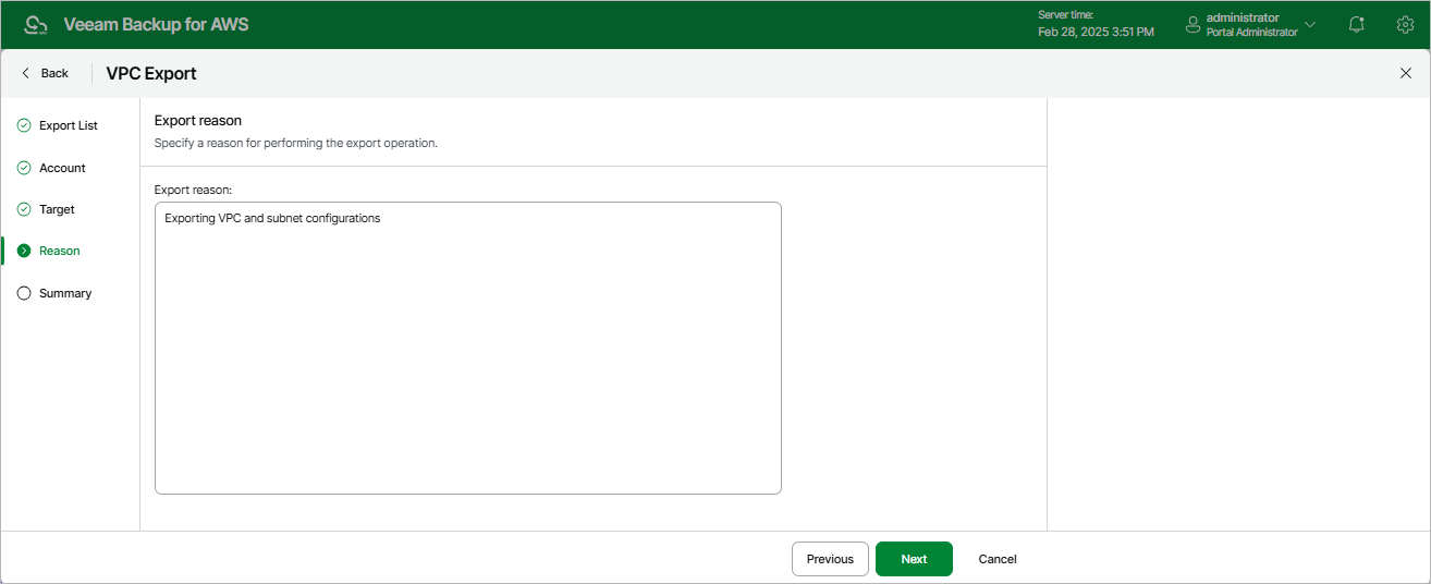 At the Reason step of the wizard, specify a reason for the export of the VPC configuration items. The information you provide will be saved in the session history and you can reference it later.