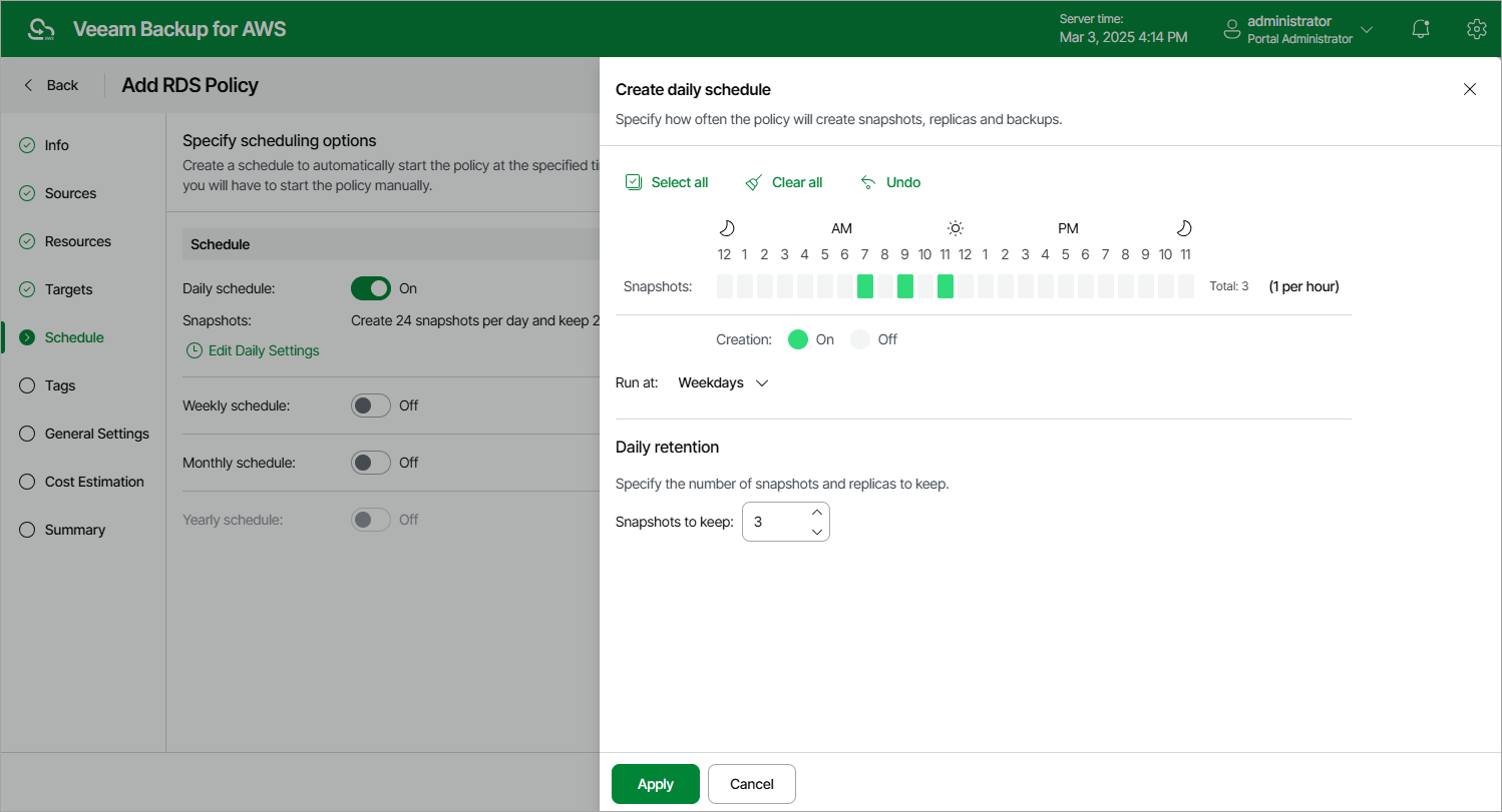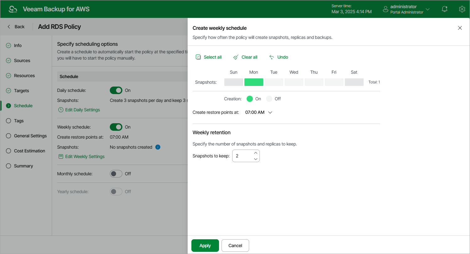 Veeam Backup for AWS will propagate these settings to the schedule of a lower frequency (which is the weekly schedule in our example).